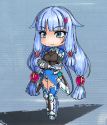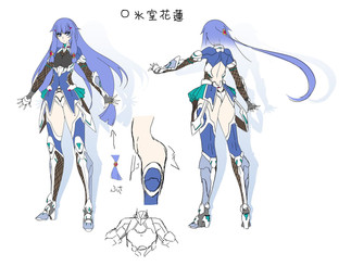 Ela é uma mulher com longos cabelos azuis e olhos azuis, bem como um pequeno busto.